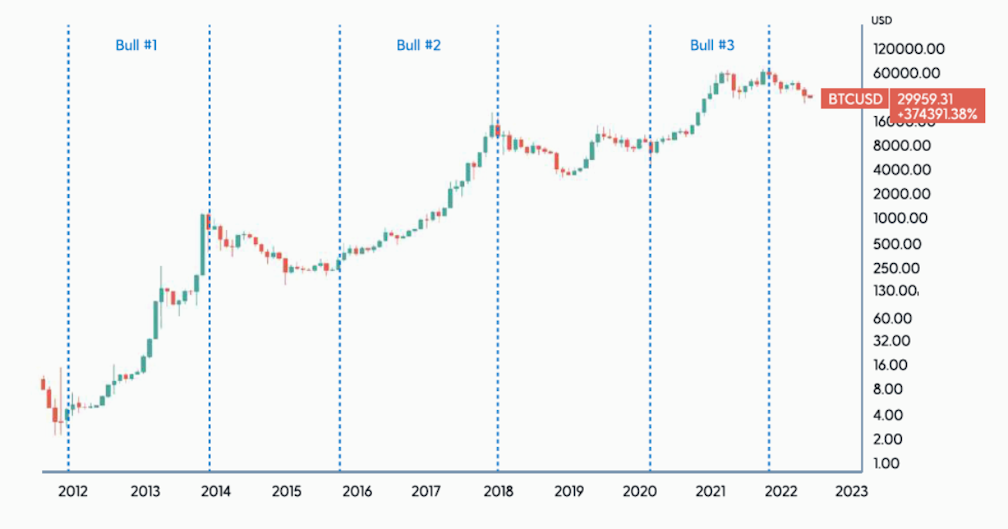 For this analysis, we will take a closer look at how the top 20 coins by market capitalization in each major Bitcoin bull cycle have performed against Bitcoin in the following cycle. There are three major bull cycles that have occurred so far in Bitcoin’s history. These are: