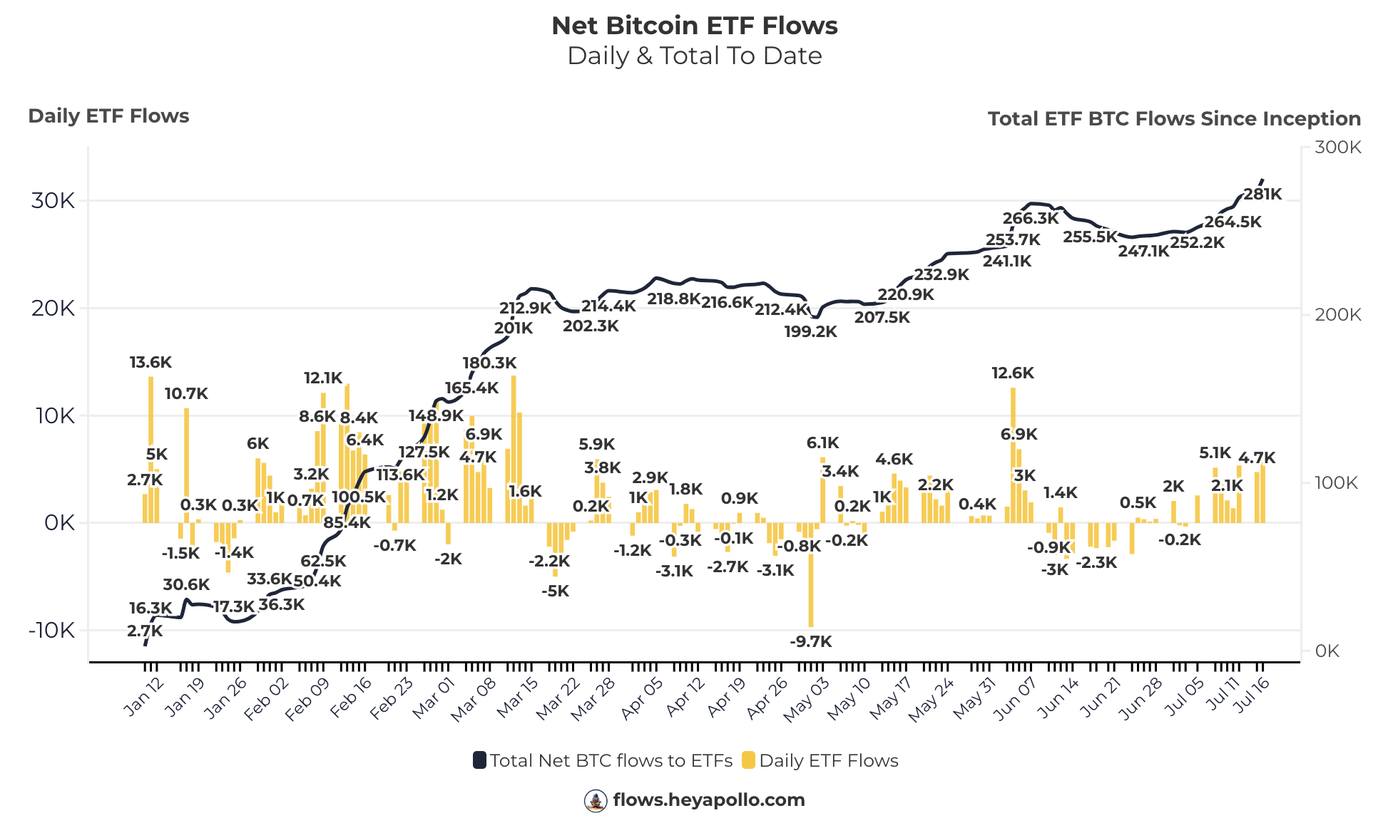 Bitcoin ETFs have seen positive net inflows every day in July, except for a single instance on July 3rd, when there were minor outflows of 200 BTC. This trend signifies a renewed momentum in the market following a subdued performance in June. Most recently, July 16th recorded a substantial inflow of 6,500 BTC up from a strong performance the prior day which saw an inflow of 4,700 BTC.