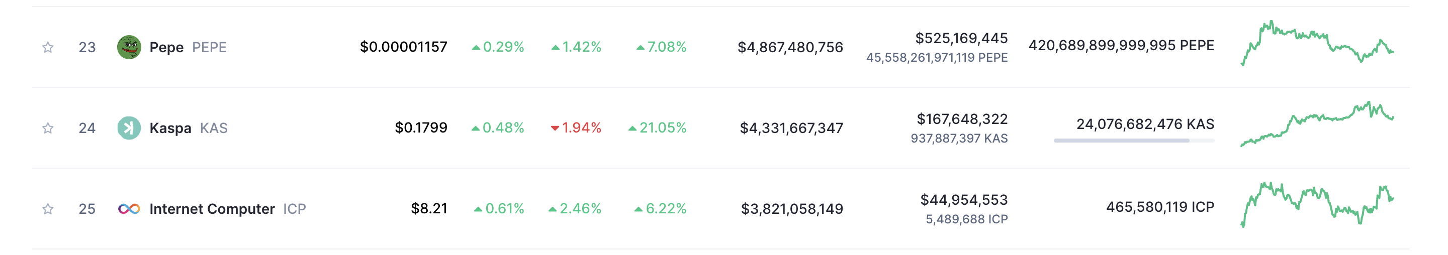Today, we will examine the methodology for analyzing any new cryptocurrency, including Kaspa. I encourage you to watch this video even if you’re not especially interested in Kaspa. Kaspa is currently ranked number 24 among cryptocurrencies by market cap, positioned between ICP (Internet Computer) and PEPE.