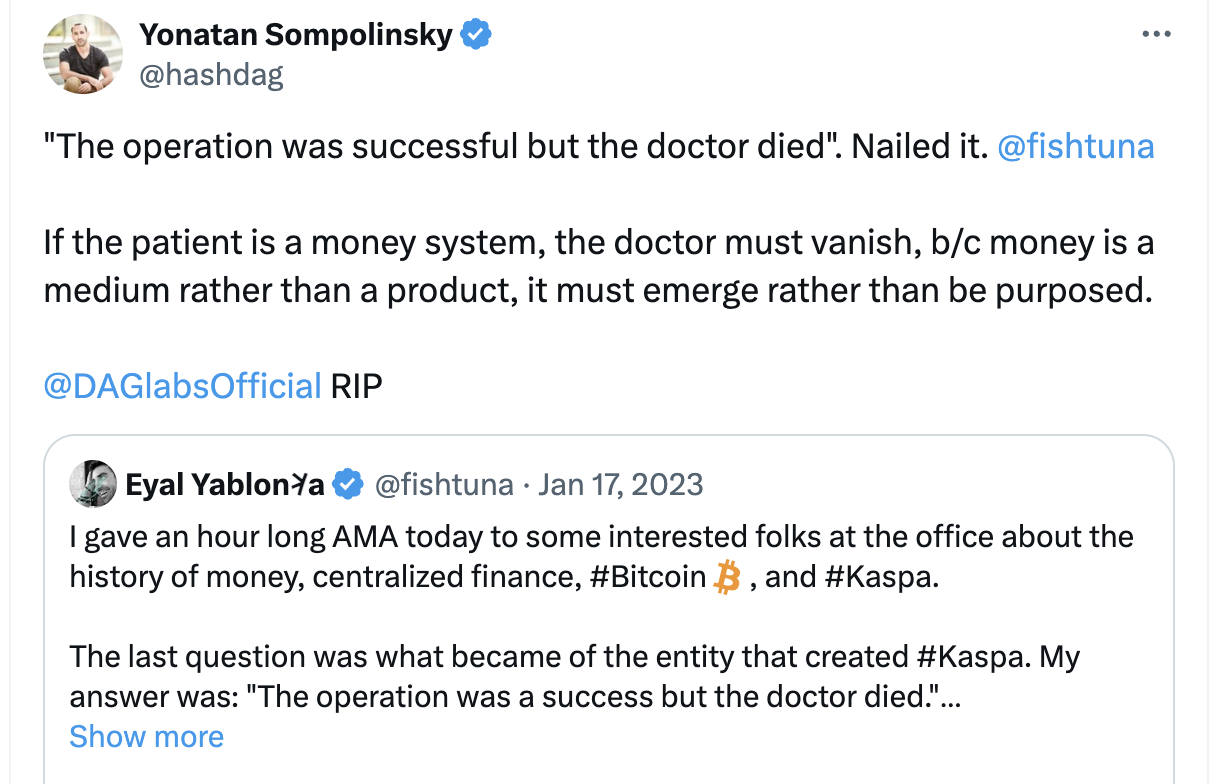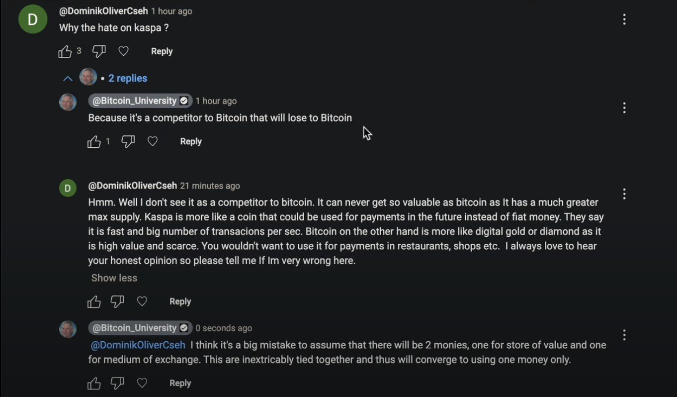 That’s why there are still different forms of money in the world, and more than one. Unless Kaspa puts a gun to our heads, it will have to compete in the free market against Bitcoin, just like fiat and other cryptocurrencies.