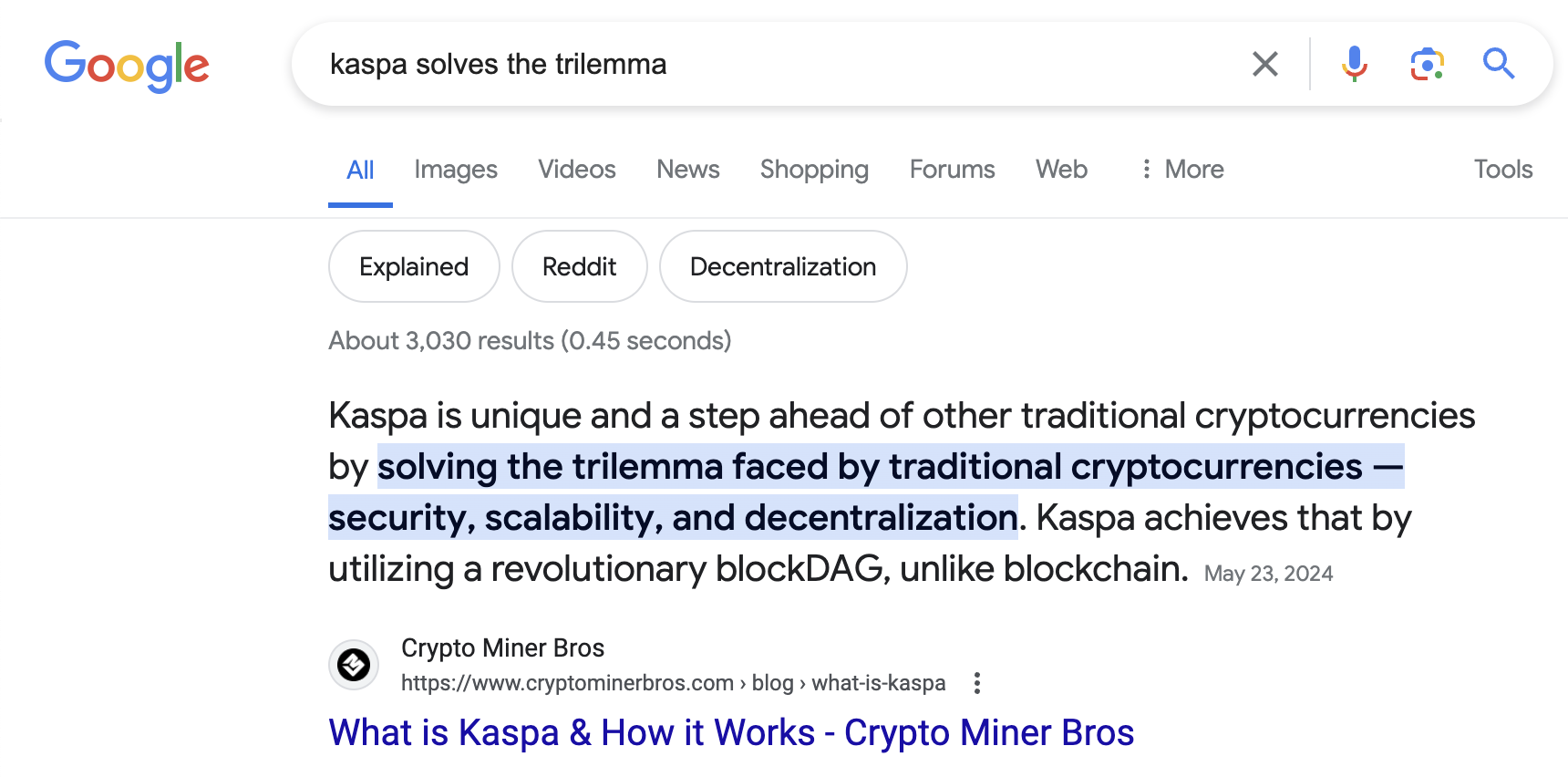 But I want to be fair. I’ll assume Kaspa’s GhostDAG is as amazing as they claim and has indeed solved the blockchain trilemma, which would be very exciting if true.