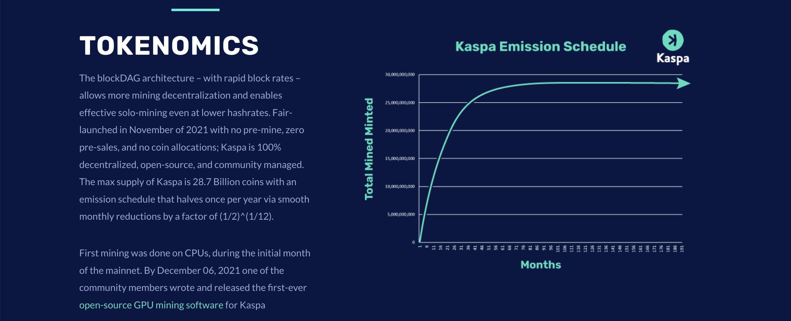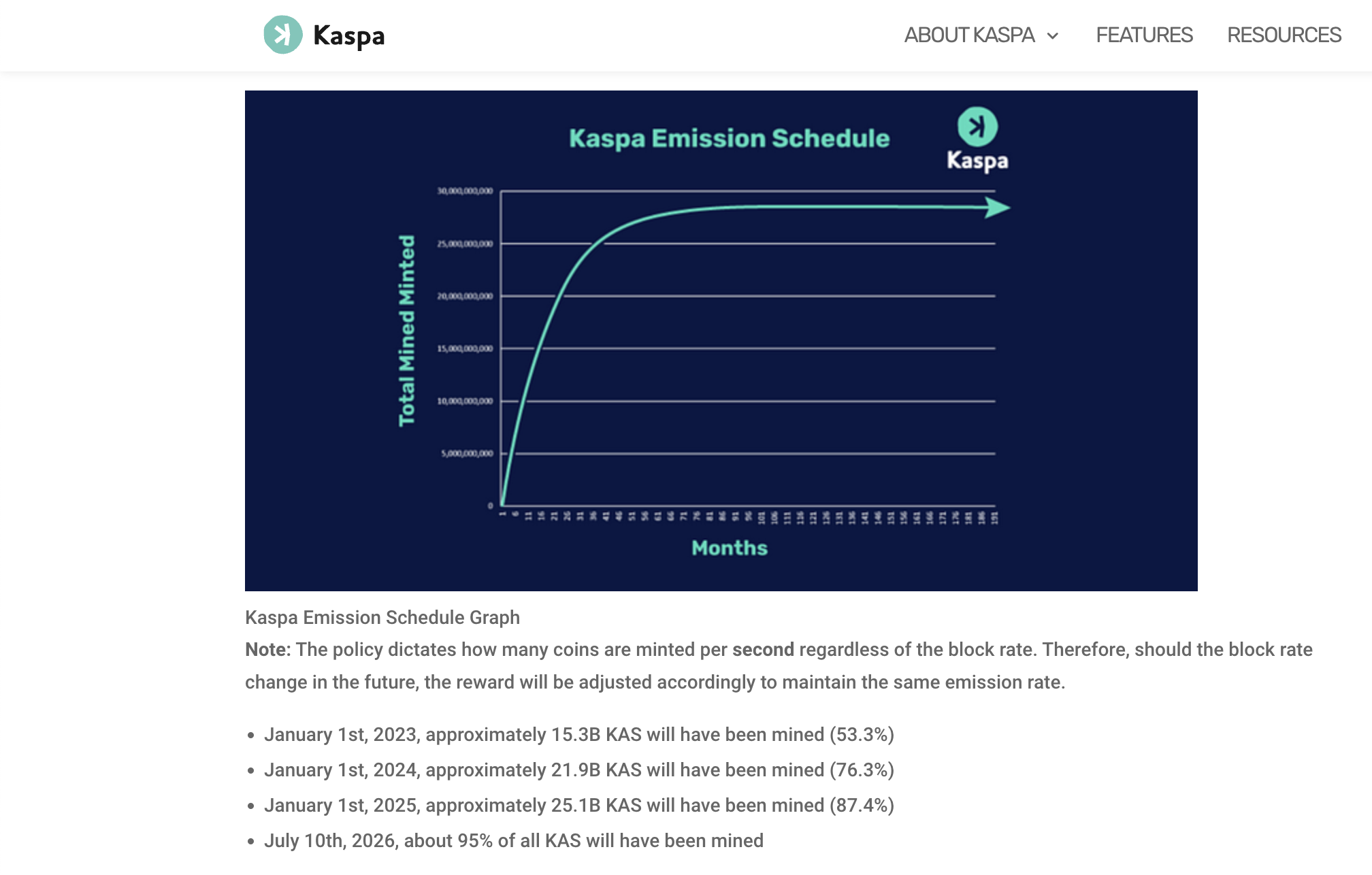 Kaspa launched in November 2021, with 95% of its coins to be mined by July 2026, a much faster issuance schedule than Bitcoin.