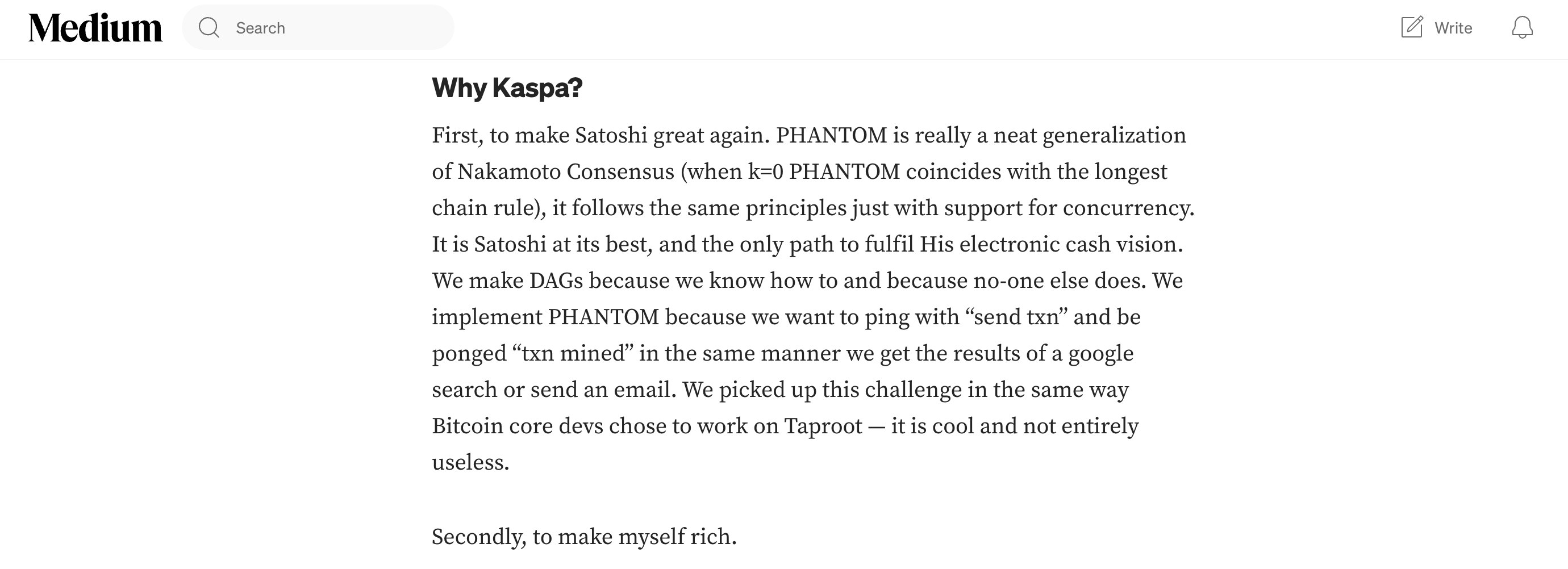 Kaspa rushes this because its founder and development team are high-time preference investors.