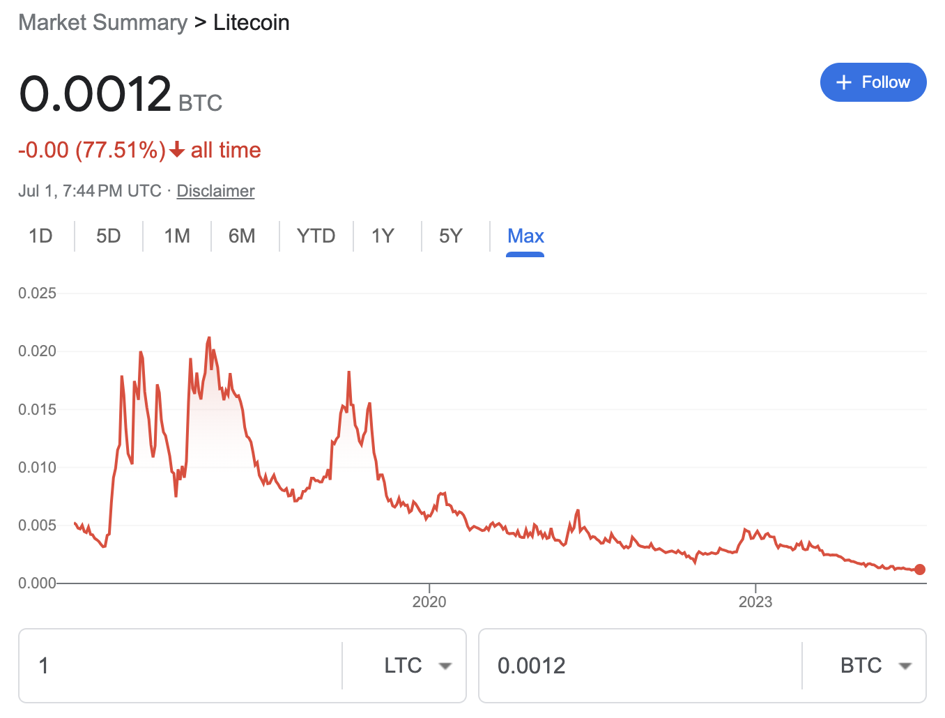 That’s the same silly marketing slogan Litecoin has been trying to use for years. This is what silver to Bitcoin’s gold has looked like for Litecoin: