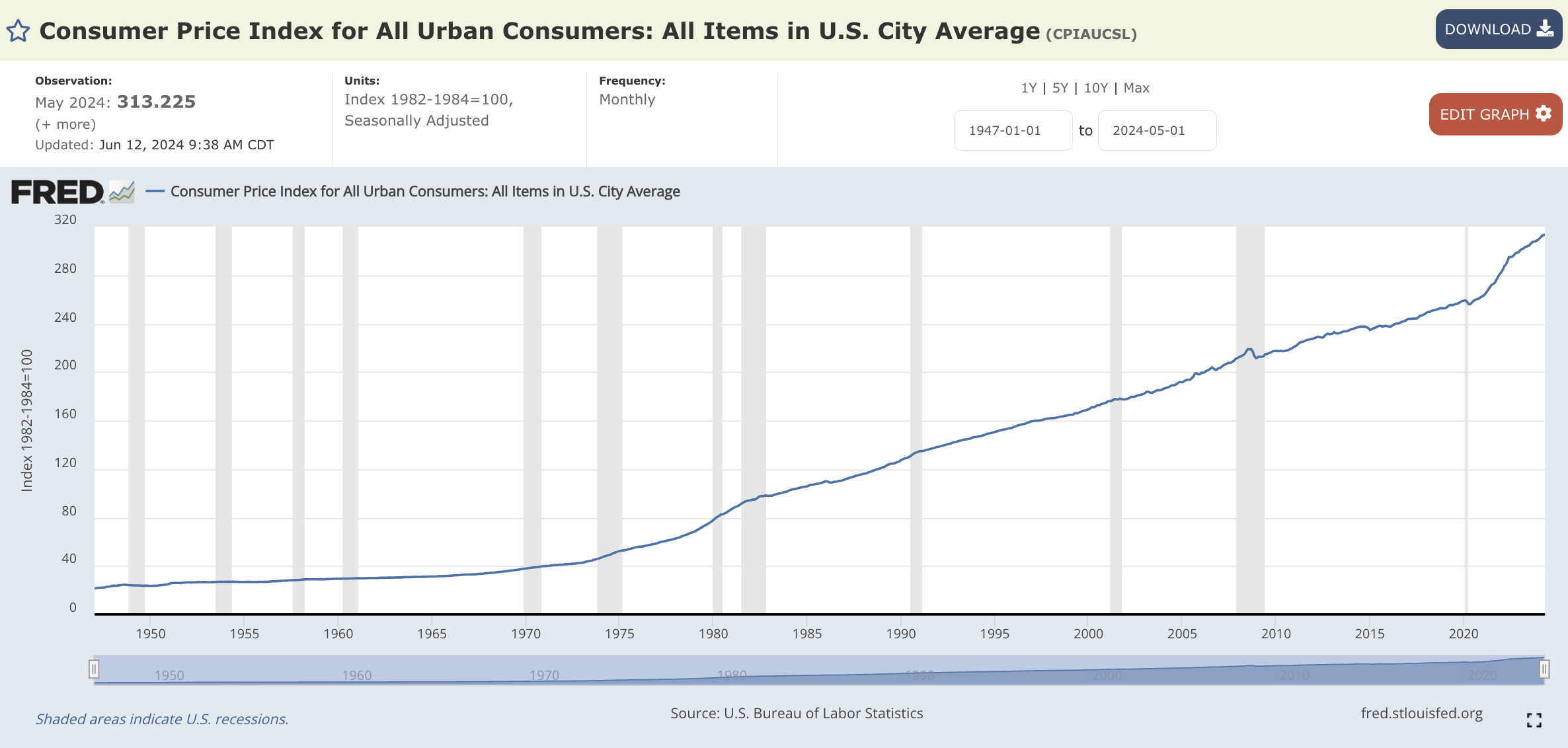 The latest CPI reading from May 2024 is 313, an approximately 12.35% increase.