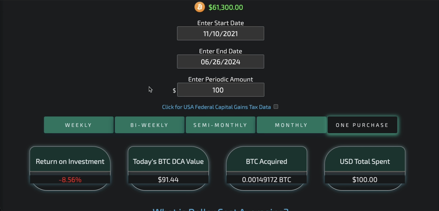 This allows you to enter a starting and ending date and decide how much you want to dollar cost average, providing a historical backtest of what would have happened.