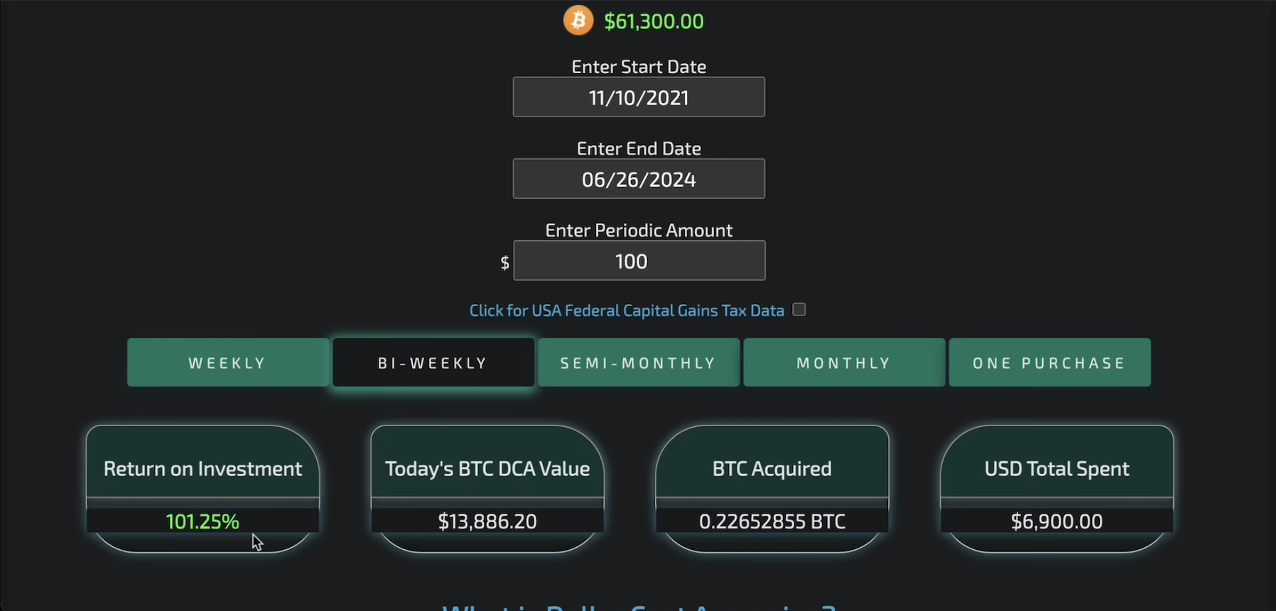 Buying $100 worth of Bitcoin every two weeks instead of weekly. If we did it semi-monthly or even monthly, our returns would be approximately the same.
