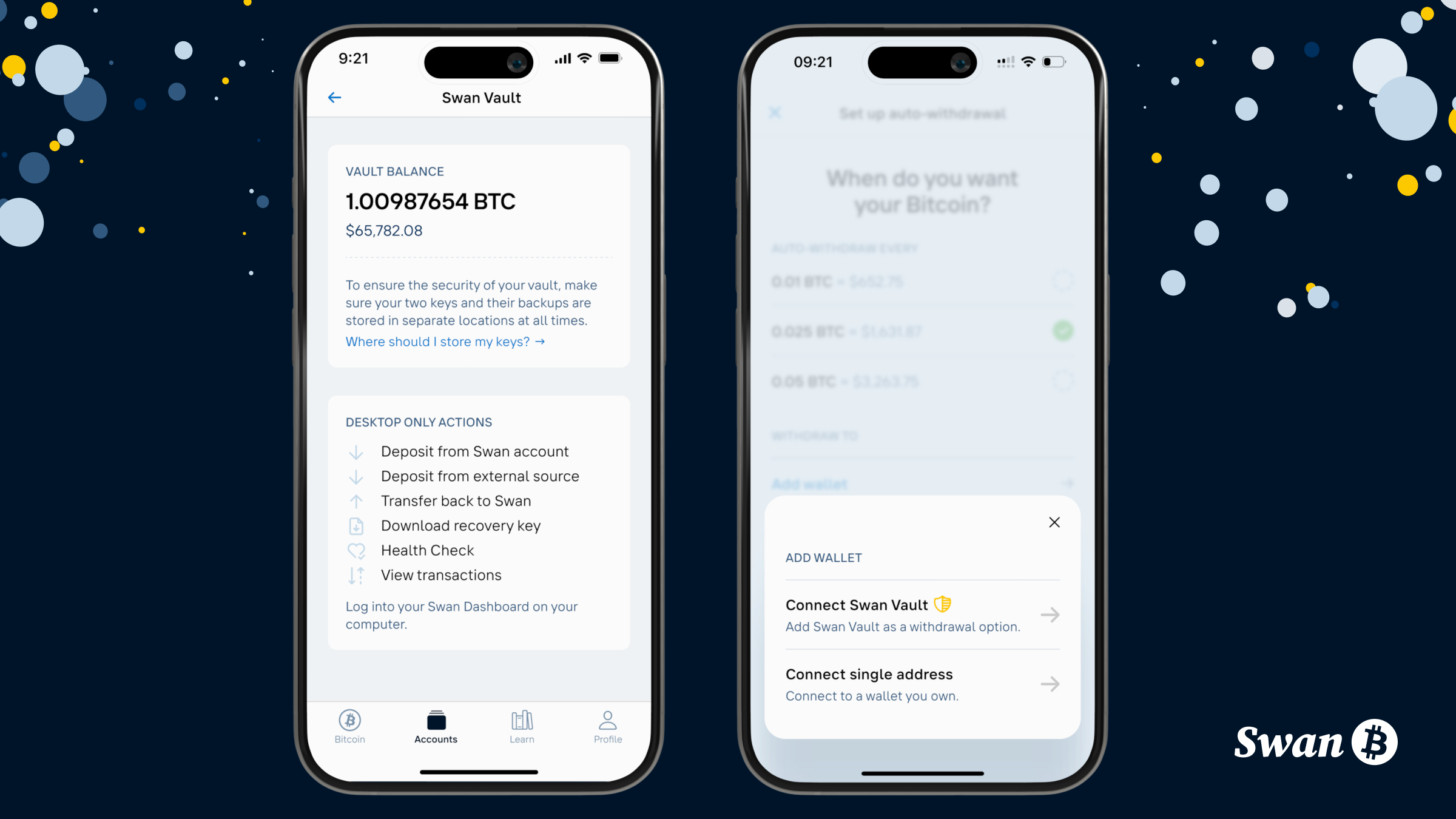 Moving Bitcoin to your Swan Vault is now effortless. You can withdraw to your Vault after unlock times or set up automatic withdrawals in the app. Automatic withdrawals to Vault are the most seamless self-custody process, with a new address being used without any manual steps. Reminder that we recommend setting automatic withdrawals at appropriate amounts.